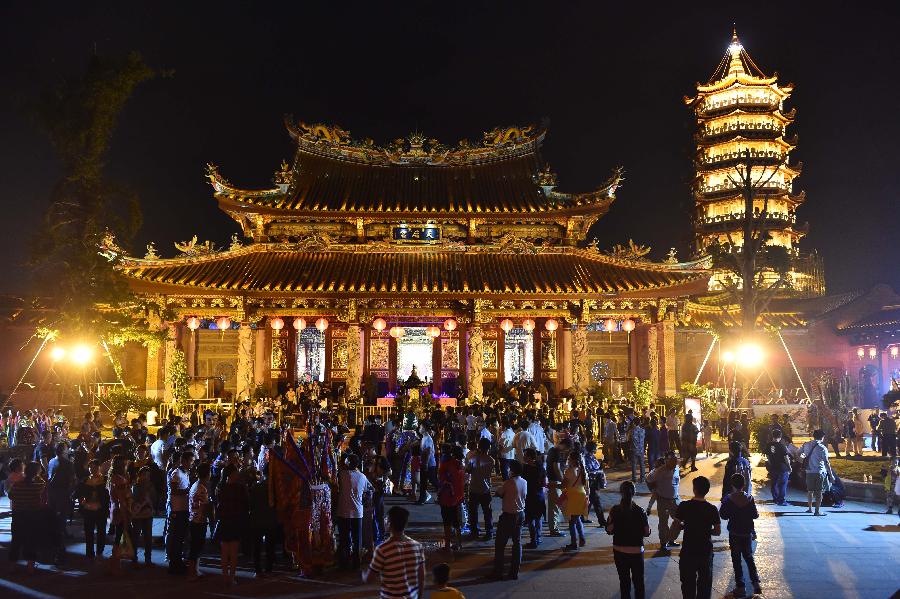 9月23日,昆山臺胞和當?shù)鼐用裨谟^賞燈會。當日,2015年海峽兩岸昆山中秋燈會在江蘇昆山慧聚寺廣場亮燈,燈會洋溢著濃郁的兩岸風情,吸引了眾多昆山臺胞和當?shù)鼐用袂皝碛^賞。新華社發(fā)(王須中 攝)