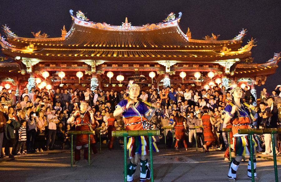 9月23日,昆山臺胞和當?shù)鼐用裨跓魰嫌^看演出。當日,2015年海峽兩岸昆山中秋燈會在江蘇昆山慧聚寺廣場亮燈,燈會洋溢著濃郁的兩岸風情,吸引了眾多昆山臺胞和當?shù)鼐用袂皝碛^賞。新華社發(fā)(王須中 攝)