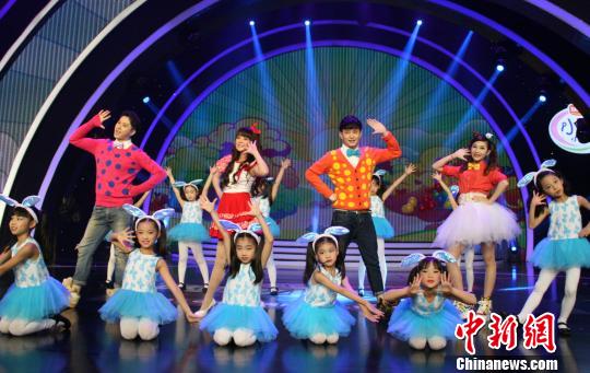 晚會(huì)上,臺(tái)灣東森電視臺(tái)蜜蜂姐姐和福建少兒頻道蝸牛哥哥、長頸鹿哥哥、芭樂姐姐帶動(dòng)兩岸小朋友作精彩表演!↑S帆 攝