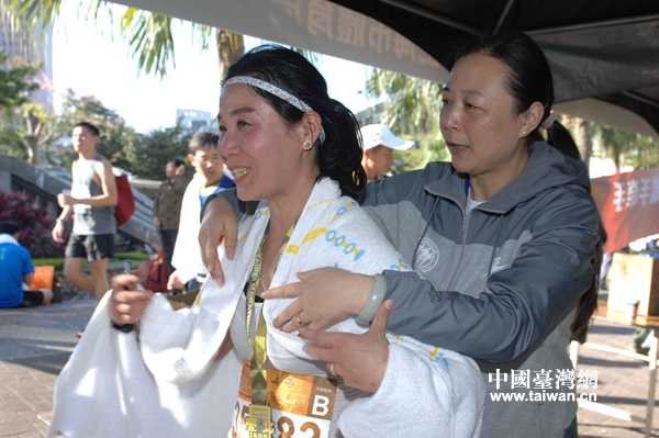上海體育局有關領導為到達終點的跑者披上大毛巾。(中國臺灣網(wǎng)發(fā) 葛鳳章 攝)