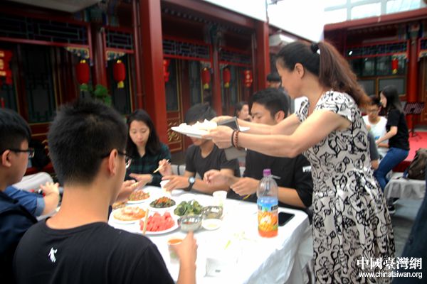 好客的北京社區(qū)居民包了四種餡的餃子歡迎客人,請來了剪紙、糖人、面人、京劇臉譜等非物質文化遺產(chǎn)傳承人與兩岸青年互動體驗,一同制作具有北京特色的紀念品,并和兩岸青年一起聯(lián)歡表演文藝節(jié)目,最后,臺灣大學生幾人一組,到社區(qū)居民家中做客,了解胡同文化,進行互動交流。