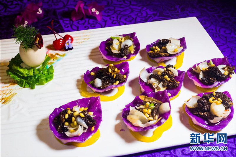 近日,三亞南山新推出用野生羊肚菌和鮮百合制作的名為“紫氣東來”素菜。新華網(wǎng)發(fā)(陳文武攝)