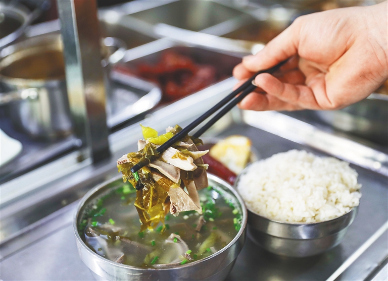 “過去的人們干活苦,早上一定要吃得實實在在,才有力氣干活。”在熱鬧非凡的辣湯飯店里,老板娘陳大姐早已習慣了每天凌晨3點就起床煮湯的生活。她介紹,辣湯飯過去是?陂_埠時期碼頭搬運工人的早餐,工人們都是天還沒有亮就要到碼頭出工,所以飯店要在開工前把食物準備好,才能夠滿足工人們補充體能的需要。