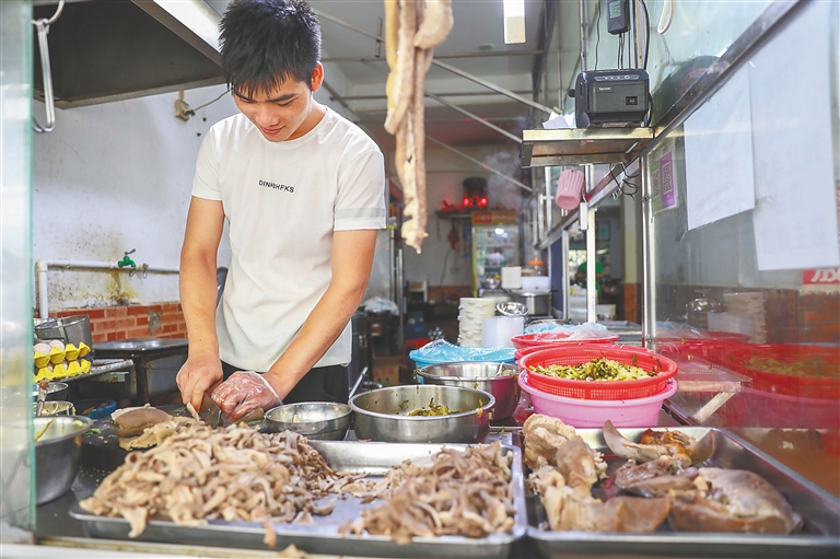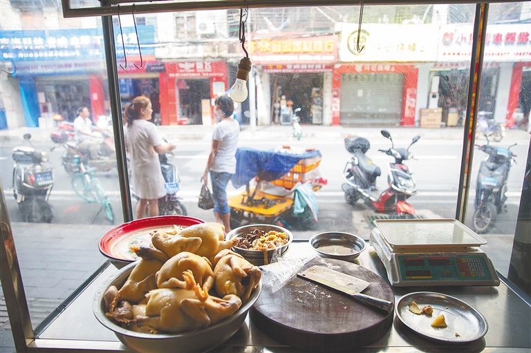 “我們已經(jīng)在這里做了40多年了,算是干了一輩子了!毙〉甑牟AЧ褡永铮故局冒著熱氣的白斬雞——黃澄澄的雞皮色澤油亮,勾人食欲。店主蘭姨笑容滿面,時常和食客閑聊幾句。