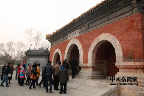 網(wǎng)媒記者們步入涿州三義宮。(中國臺(tái)灣網(wǎng) 焦源源 攝)