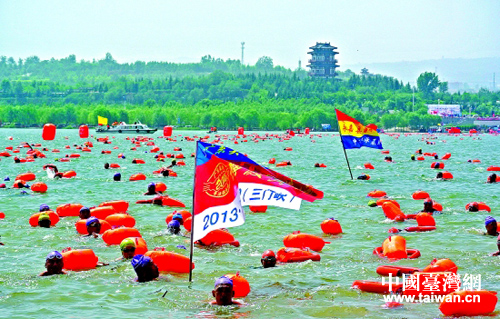 “2013中國·三門峽橫渡母親河”活動在三門峽天鵝湖國家城市濕地公園黃河水域舉行。(圖片來源:三門峽臺辦)