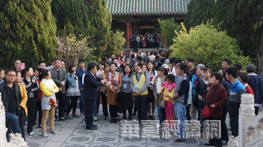 兩岸三地的記者聽講解員介紹大相國寺的歷史由來和佛教典故。