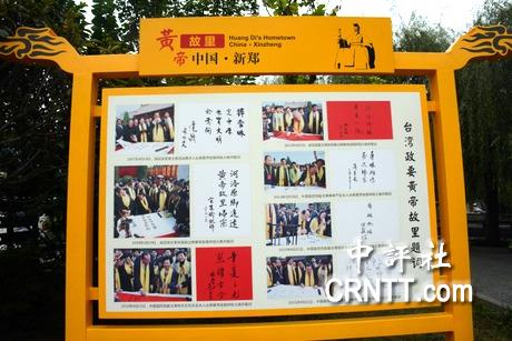河南新鄭黃帝故里有一塊大看板,展示臺(tái)灣政要名拜祖的影像與題字。(中評(píng)社 趙家麟攝)