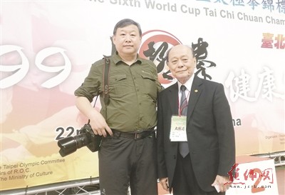 在比賽現(xiàn)場的主席臺旁,記者試圖采訪了解這次比賽的基本情況,工作人員熱情地接待并把我介紹給在主席臺就座的一位長者。沒想到這位精神矍鑠的老人竟是臺灣地區(qū)太極拳總會理事長黃裕盛,記者激動地掏出名片自我介紹。