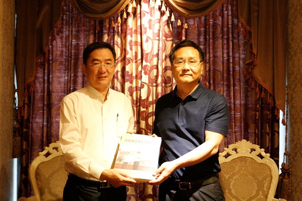 安陽市委統(tǒng)戰(zhàn)部副部長李春喜向胡明揚(yáng)贈(zèng)送周易文化書籍。(圖片來源:安陽市委)