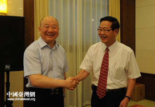 湖北省副省長(zhǎng)田承忠與臺(tái)灣南投縣縣長(zhǎng)李朝卿親切握手。(湖北省臺(tái)辦 陸勝 攝)
