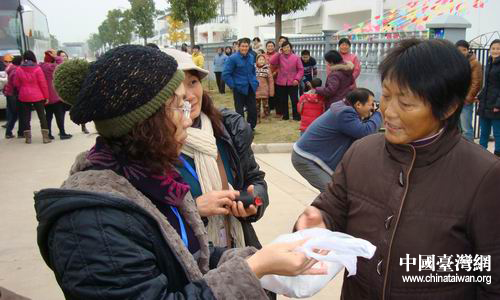 “來,大家吃些紅薯干!”臉上帶著羞澀的幸福,小兩口忙前忙后開始招待客人:“這是用自家產(chǎn)的紅薯做的,薄皮紅心可甜啦!希望我們海峽兩岸的農(nóng)民在這樣的“同行”之中凝結出紅紅的“同心”——中國心!焙,又是一陣熱烈的掌聲。