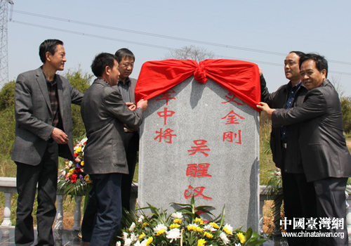黃陂區(qū)領(lǐng)導(dǎo)與吳醒漢嫡孫為吳醒漢墓揭幕。(圖片來源:武漢市臺辦)