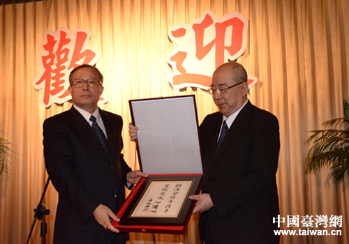 5月28日,在圓山飯店與吳伯雄先生互贈(zèng)禮品。(圖片來源:湖北省臺辦)