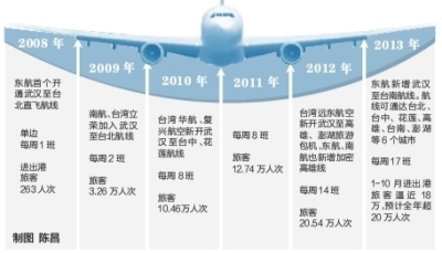 2008年,經(jīng)積極爭取,我市成為中部地區(qū)唯一直航臺灣的城市,此后不斷申請航權,積極協(xié)調(diào)航空公司開通赴臺航線。“每年舉辦湖北武漢臺灣周、臺灣湖北武漢周,這些活動有力促進了互動,對空港發(fā)展注入持續(xù)動力”。