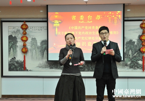 中國(guó)臺(tái)灣網(wǎng)1月25日武漢訊 新年伊始,氣象更新,在喜迎新春佳節(jié)的日子里,為深入學(xué)習(xí)貫徹黨的十八屆六中全會(huì)精神,推進(jìn)機(jī)關(guān)精神文明建設(shè)和文化建設(shè),元月24日下午,省委臺(tái)辦舉辦了一場(chǎng)寓政治性、知識(shí)性、娛樂(lè)性于一體別開生面的《關(guān)于新形勢(shì)下黨內(nèi)政治生活若干準(zhǔn)則》《中國(guó)共產(chǎn)黨問(wèn)責(zé)條例》和《中國(guó)共產(chǎn)黨黨內(nèi)監(jiān)督條例》知識(shí)競(jìng)賽暨迎新春職工聯(lián)歡活動(dòng)。