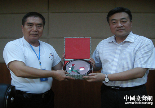 臺灣領(lǐng)隊陳蜀龍(左)和湖南文理學(xué)院黨委書記李民互贈禮品。(圖片來源:常德市臺辦)