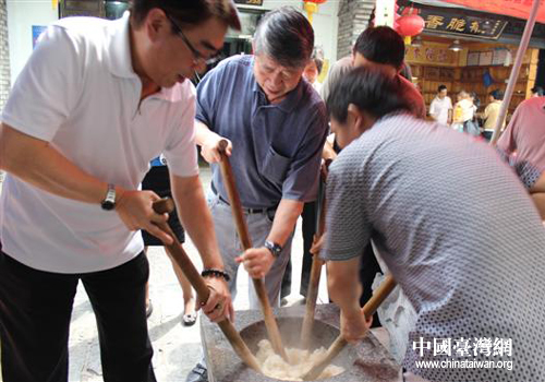 張孝威與民間小吃商一起制作民間傳統(tǒng)美食。(圖片來源:岳陽市臺(tái)辦)