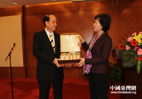 黃蘭香與林中森互贈(zèng)紀(jì)念品。(圖片來源:岳陽市臺(tái)辦)