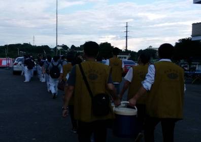 夜幕將下,志愿者們邁著堅實的步伐,向災民安置點行去。為了不增加安置點接待處負擔,志愿者們自帶飲用水和實物。后圖中,志工們手中抬著的桶子,是他們自備的干糧和茶水。