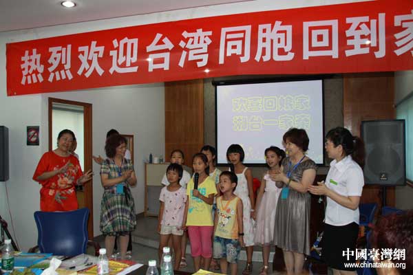 大陸配偶們在長沙市雨花區(qū)侯家塘廖家灣社區(qū)與當(dāng)?shù)鼐用窈椭驹刚呙鎸γ娼涣鳎瑘D為和社區(qū)小朋友一起共唱《姐妹》。(中國臺灣網(wǎng) 楊永青 攝)