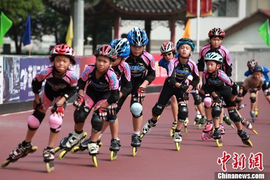 8月11日,海峽兩岸少年輪滑交流夏令營在中國輪滑協(xié)會蘇州訓練基地開營。在八天的時間里,30位臺灣少年與35位大陸少年將共同通過訓練與交流。圖為輪滑少年們在訓練中。中新社發(fā) 李克祥 攝