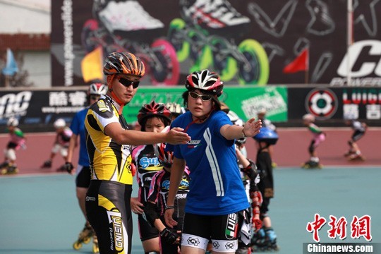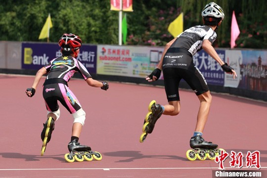 圖為兩位輪滑少年訓練起跑技術。中新社發(fā) 李克祥 攝