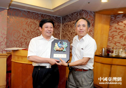 金湖縣委書記肖進(jìn)方與臺(tái)北市工業(yè)會(huì)理事長(zhǎng)魏昇煌互贈(zèng)紀(jì)念品。(圖片來源:金湖縣臺(tái)辦)