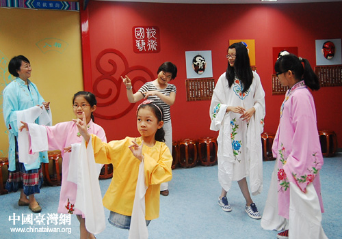 在園區(qū)青少年活動中心,訪問團集中參觀了活動中心的國粹館,蘇州民間文化交流中心專家錢杏珍老師為大家詳細介紹了蘇州的桑蠶文化。臺灣中學(xué)生向藝術(shù)指導(dǎo)老師學(xué)習(xí)了剪紙、書法、手工紡織,還與小昆劇團學(xué)員們互動體驗了昆曲表演。