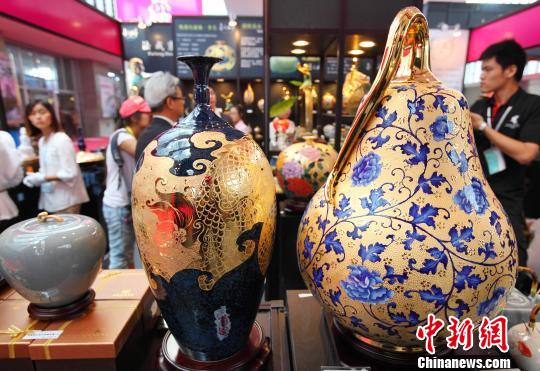 9月20日,在江蘇南京舉辦的2012臺(tái)灣名品交易會(huì)上,文創(chuàng)金點(diǎn)館內(nèi)展出的臺(tái)灣雕金彩瓷格外的搶眼。中新社發(fā) 泱波 攝