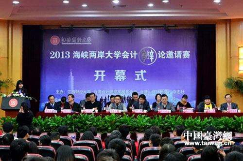 中國臺灣網(wǎng)12月9日南昌消息 日前,2013海峽兩岸大學(xué)會計(jì)辯論邀請賽開幕式在江西財(cái)經(jīng)大學(xué)蛟橋園舉行。江西財(cái)經(jīng)大學(xué)副校長鄧輝致歡迎辭,臺灣會計(jì)研究發(fā)展基金會委員謝國松、臺灣大學(xué)教授陳國泰、中南財(cái)經(jīng)政法大學(xué)教授湯湘希、臺灣參賽選手代表游佳璇先后發(fā)言。