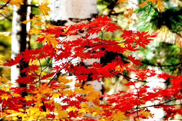 在蛟河、在樺甸……紅楓林、白樺林,紅的嬌艷、白的無暇,深淡相宜,錯落有致,風(fēng)姿各異,宛如夢幻般的童話世界。