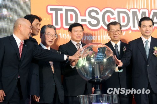11月24日,中國電子工業(yè)標(biāo)準(zhǔn)化技術(shù)協(xié)會(huì)和中國通信標(biāo)準(zhǔn)化協(xié)會(huì)名譽(yù)理事長婁勤儉(右3),和臺(tái)灣金仁寶集團(tuán)董事長許勝雄(左3)等在臺(tái)北共同按下啟動(dòng)球,宣告臺(tái)灣威寶電信“TD-SCDMA試驗(yàn)網(wǎng)”正式開通。臺(tái)灣TD試驗(yàn)網(wǎng)的開通,是落實(shí)海峽兩岸信息產(chǎn)業(yè)技術(shù)標(biāo)準(zhǔn)論壇達(dá)成的共識(shí),展示兩岸在第三代移動(dòng)通信系統(tǒng)TD-SCDMA技術(shù)、研發(fā)和產(chǎn)業(yè)化方面所取得的合作成果。 中新社發(fā) 黃少華 攝