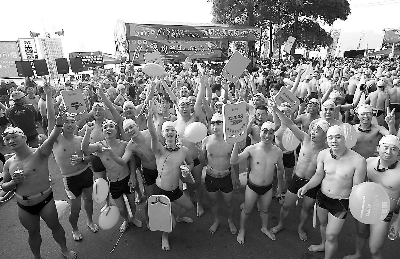 通過“小三通”航線首次參加日月潭國際萬人泳渡活動的福州冬泳隊(duì)員們,在開幕式上當(dāng)聽到主辦方主持人呼喚自己的隊(duì)伍時(shí),群起歡呼響應(yīng)。(資料圖片)