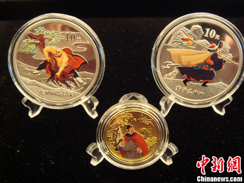 圖為中國人民銀行發(fā)行的《水滸傳》彩色金銀紀念幣(第1組)部分紀念幣圖片。