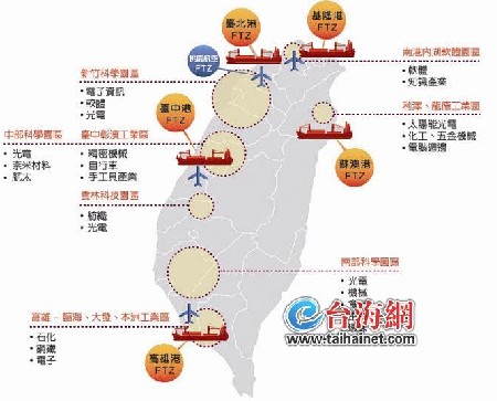 2013年,臺(tái)“行政院”核定了“自由經(jīng)濟(jì)示范區(qū)規(guī)劃方案”,希望透過“六海一空一農(nóng)技”的規(guī)劃,將自由貿(mào)易范圍由“區(qū)內(nèi)”逐漸擴(kuò)大到全臺(tái)灣。也就是說,“六海一空一農(nóng)技”是臺(tái)灣走向自由貿(mào)易的基石和起點(diǎn)。在這個(gè)提法之中,除去屏東農(nóng)業(yè)生技園區(qū)之外,其他“六海一空”恰好是臺(tái)灣最為重要的海運(yùn)和空運(yùn)港口所在地。在臺(tái)當(dāng)局自由經(jīng)濟(jì)示范區(qū)的兩階段推動(dòng)計(jì)劃中,今年8月啟動(dòng)的第一階段規(guī)劃強(qiáng)調(diào)在“六海一空”自由貿(mào)易港區(qū)內(nèi)采用“前店后廠”概念,在智慧運(yùn)籌、農(nóng)業(yè)價(jià)值運(yùn)銷及國(guó)際產(chǎn)業(yè)合作等領(lǐng)域,促進(jìn)人員、商品與資金自由流動(dòng)。