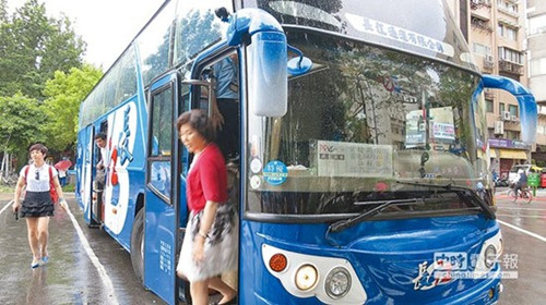 5月27日,大陸無(wú)錫的高端團(tuán)赴臺(tái),游覽車(chē)上還特別標(biāo)明“首發(fā)高端團(tuán)”。資料照片:臺(tái)灣“中時(shí)電子報(bào)”