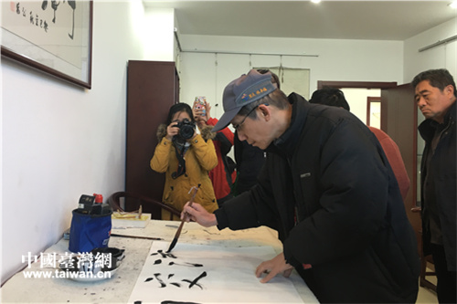 在核桃園社區(qū),高雄本安里里長(zhǎng)林辛福練書(shū)法。(中國(guó)臺(tái)灣網(wǎng) 段雯婷 攝)
