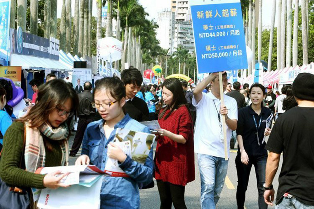 圖:臺(tái)灣大學(xué)舉辦的臺(tái)大校園徵才博覽會(huì)上,應(yīng)聘者在閱讀傳單 資料圖片