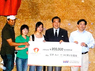 世博會臺灣館昨天下午參觀人數(shù)突破20萬名,臺北世貿(mào)中心董事長王志剛(右二)致贈宏碁筆記本電腦給來自上海的幸運(yùn)參觀者顧孫麗(右三)。圖片來源:臺灣《聯(lián)合報》