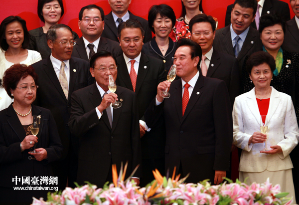 中國(guó)臺(tái)灣網(wǎng)6月29日重慶消息 今天下午2時(shí)30分許,海協(xié)會(huì)與臺(tái)灣;鶗(huì)在重慶申基索菲特大酒店,舉行兩岸經(jīng)濟(jì)合作框架協(xié)議(ECFA)以及兩岸知識(shí)產(chǎn)權(quán)保護(hù)合作協(xié)議簽字儀式。順利簽署后,陳云林、江丙坤同兩會(huì)代表團(tuán)成員合影留念,二人并舉杯互致慶賀。(記者 張弛 鐘寶華)