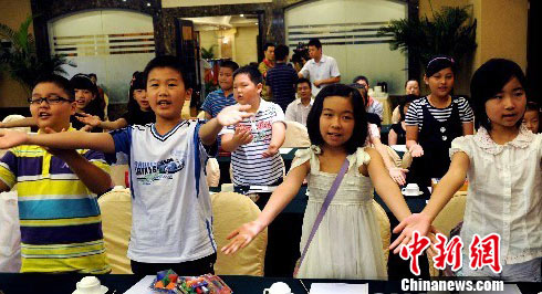7月1日,在福州舉行的“2010·陽光海峽——兩岸快樂小天使活動營”的新聞發(fā)布會上,福建小營員們張開雙手盼望與臺灣小伙伴們早日相聚。 中新社發(fā) 劉可耕 攝