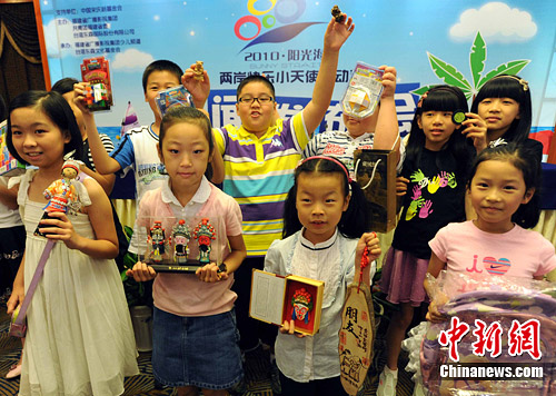 7月1日,在福州舉行的“2010·陽光海峽——兩岸快樂小天使活動營”的新聞發(fā)布會上,福建小營員代表們展示他們準備贈送給臺灣小伙伴的禮物——泉州木偶、京劇臉譜、上海世博會吉祥物海寶、家中珍藏的福州三坊七巷明信片、郵票、魔術道具等。2010·陽光海峽——兩岸快樂小天使活動營”將在7月5日到7月12日期間舉行。屆時,近100名臺灣的小朋友將分別和福州、泉州、廈門的孩子們“同唱一首歌”、“同誦一篇章”、“同習一套拳”、“同游一江水”、“同看一出劇”、“同繪一幅畫”,并有一次“同是一家人”般的親切民宿體驗。2010·陽光海峽——兩岸快樂小天使活動營”是以海峽兩岸少年兒童為主體的大型文化交流活動,也是目前海峽兩岸文化交流中唯一由兩岸媒體聯(lián)合主辦的交流活動,該活動曾于2007年和2008年成功舉辦了兩屆。中新社發(fā) 劉可耕 攝