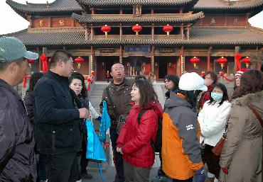2月19日下午,來(lái)自臺(tái)灣的游客正在臨汾堯廟廣運(yùn)殿前聽(tīng)導(dǎo)游講解先祖堯王的故事以及堯廟的來(lái)由。