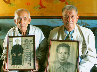 薛秋帆(右)和蔡騰芳(左)捧著蔡老先生夫婦的遺像追思。