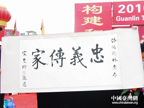 親民黨主席宋楚瑜賀詞:忠義傳家。圖片來源:洛陽市臺辦