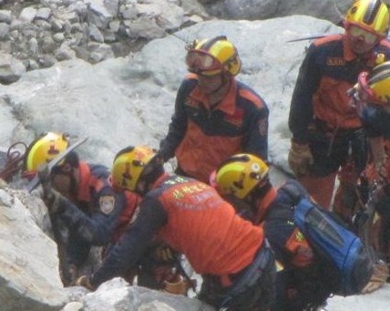包括臺(tái)北市和臺(tái)北縣支援的搜救人員,昨天一整天都在蘇花公路崩塌處仔細(xì)搜索,由于山壁陡峭,垂直近乎90度,搜救人員只能在身上綁著繩索,攀爬梯子緩緩下降到谷底,搜索工作困難萬分。