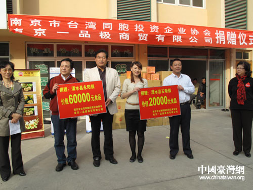 中國(guó)臺(tái)灣網(wǎng)11月17日南京消息 日前,在南京市臺(tái)辦、溧水縣臺(tái)辦組織下,南京市臺(tái)灣同胞投資企業(yè)協(xié)會(huì)、南京一品極商貿(mào)有限公司向溧水縣永陽(yáng)鎮(zhèn)、石湫鎮(zhèn)分別捐贈(zèng)了價(jià)值6萬元和2萬元的臺(tái)灣特色食品。