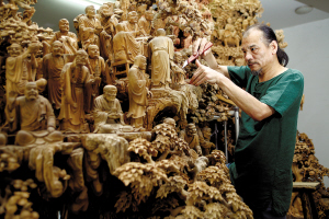 所以現(xiàn)在他已經(jīng)開(kāi)始考慮少賺錢甚至是不賺錢,而多做一些能傳世的東西。當(dāng)年他與兩百人花了六年時(shí)間完成日本無(wú)量壽寺的雕刻就給了他很大的啟發(fā)!敖酉聛(lái)我想做一些比如‘大好河山’之類的題材,把每個(gè)省最有代表性的風(fēng)景名勝刻下來(lái)。還有農(nóng)歷新年前會(huì)出一本書(shū),詳盡地介紹如何分辨木材如何使用刻刀、如何磨刀,分享我三十多年來(lái)的經(jīng)驗(yàn)!