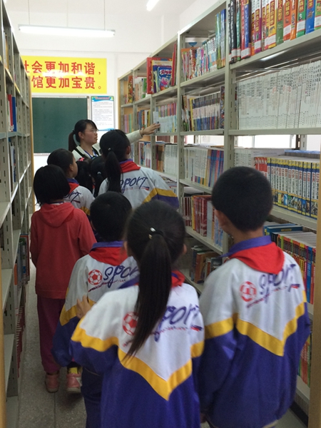 鵝公鎮(zhèn)中心小學(xué)的學(xué)生在老師帶領(lǐng)下進(jìn)入圖書(shū)室借書(shū)